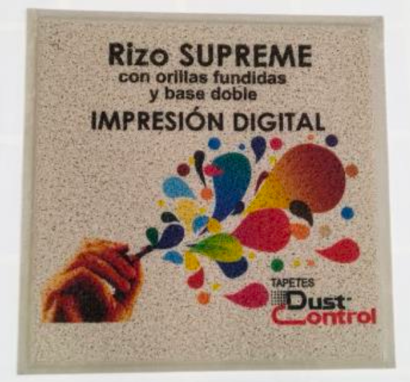 El tapete publicitario de CUADROS con doble base de hule, tiene en la superficie un tejido absorbente de poliéster que es impreso por sublimación con colores intensos y brillantes. Se le vulcaniza permanentemente una base doble de hule SBR para darle cuerpo al tapete y evitar que se arrugue y se mueva. Al mismo tiempo se le moldean los cuadros para darle textura a la superficie. Tiene la característica y ventaja de que solo se ensucian las crestas de los cuadros por lo que la imagen impresa se sigue viendo con claridad aun cuando se ensucie el tapete. Esto permite que se utilice este tapete en las entradas para comunicar, atrapar un poco de suciedad y absorber un poco de humedad. Las orillas se pueden cortar a hueso o se le puede dejar un borde de hule negro como puede ver en la foto. Es completamente lavable, muy resistente y durable. Su altura aproximada es de 5mm. Se puede fabricar desde una pieza que puede ser de hasta 1.45×2.90m máximo.